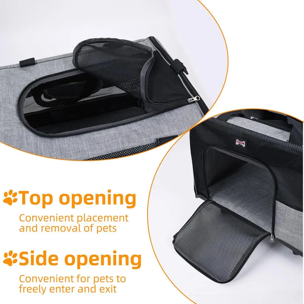 1.Convenient Access & Transport: Engineered with pet comfort in mind, this carrier features top and side openings for easy access. The 2-inch smooth-rolling casters, removable shoulder strap, and sturdy handle allow versatile carrying—by hand, over the shoulder, or as a wheeled trailer
